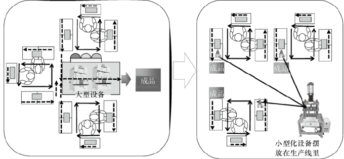 大型设备往往会为了追求生产的最大化而牺牲产品的切换次数,这容易造成生产过量,生产了很多不需要的产品放到仓库中。另外,大型设备在做流程化生产时,很难编排到生产线中形成连续流,这是因为设备太大、设备运行速度过快、很多生产线共用导致的。同时,大型设备的操作区域比较大,容易造成动作浪费和移动上的浪费。小型设备具有以下特点:节省空间,设备之间的距离比较近,当流程变化或实验新产品时,把它们移动到另外的地方更容易。设备小型化,价格也就更便宜,这样可以进一步扩大生产线,同时由于小型设备的稳定性较强,可以减少维修的等待时间。小型化设备改善如下图所示。